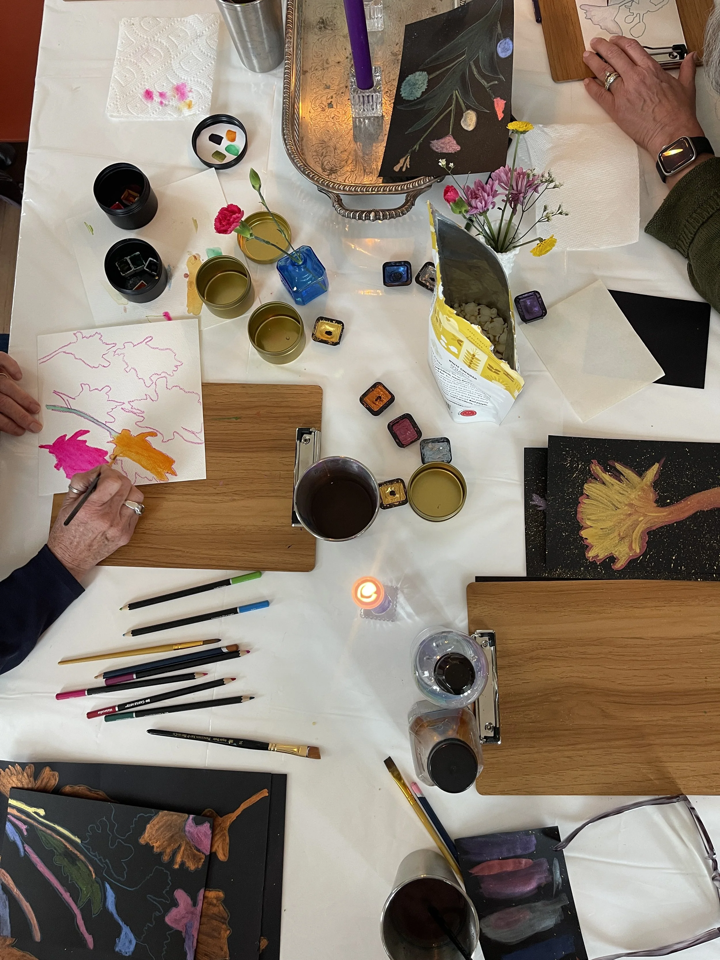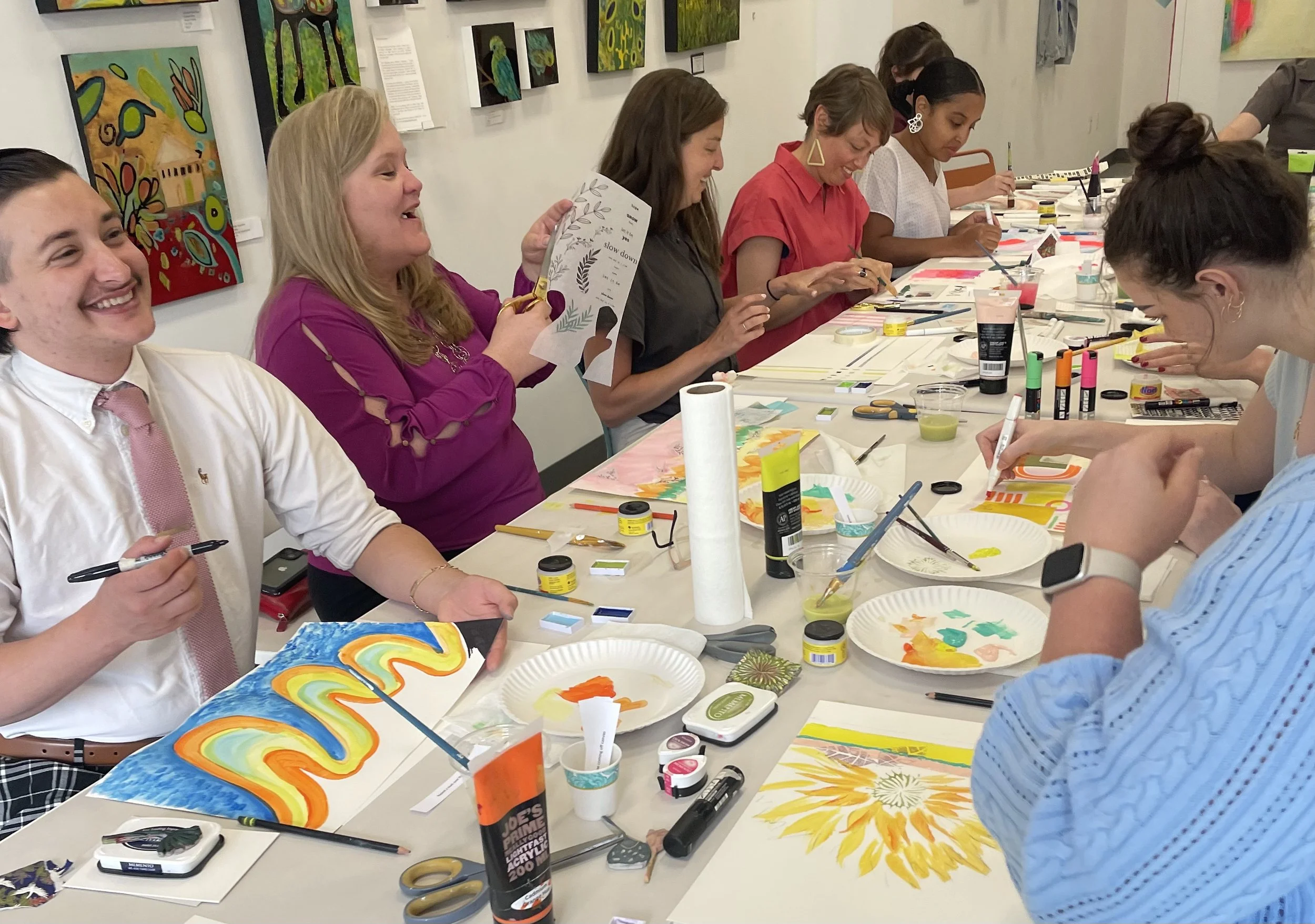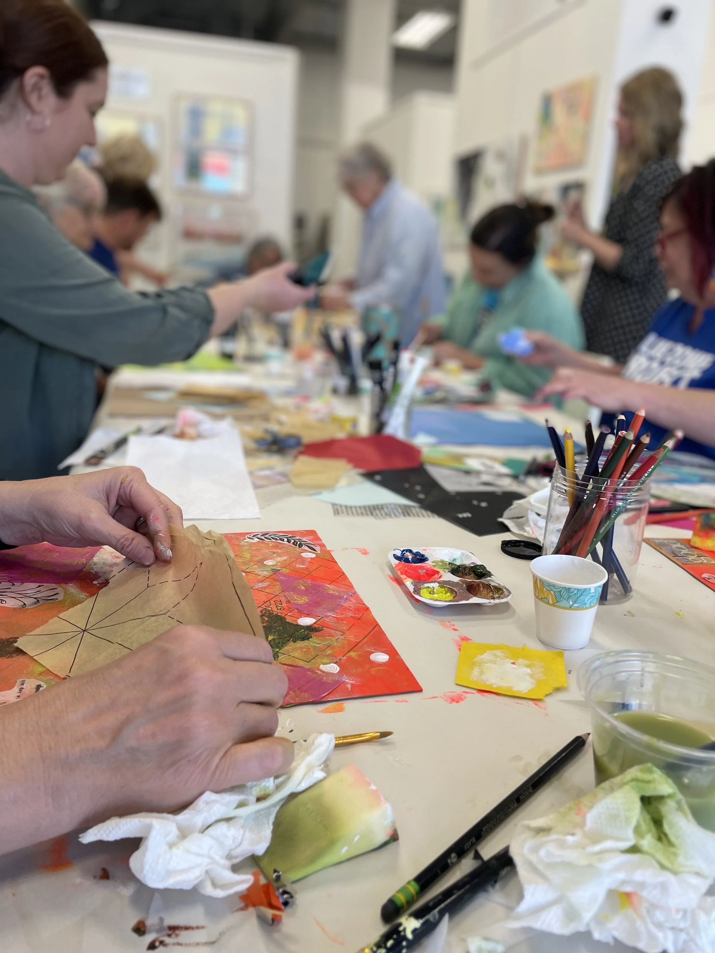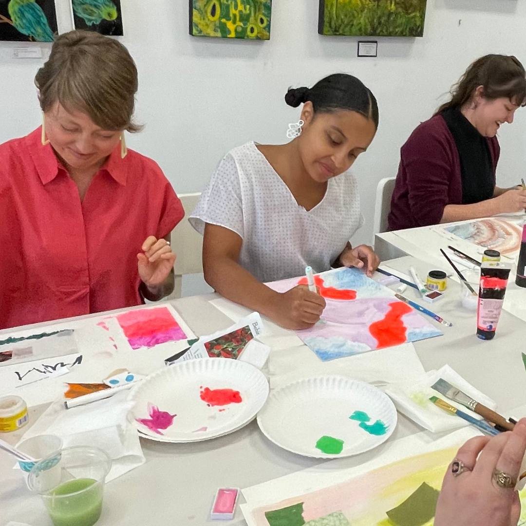 Group of people participating in an art class, painting and creating artwork at a long table, with colorful paintings displayed on the wall behind them.