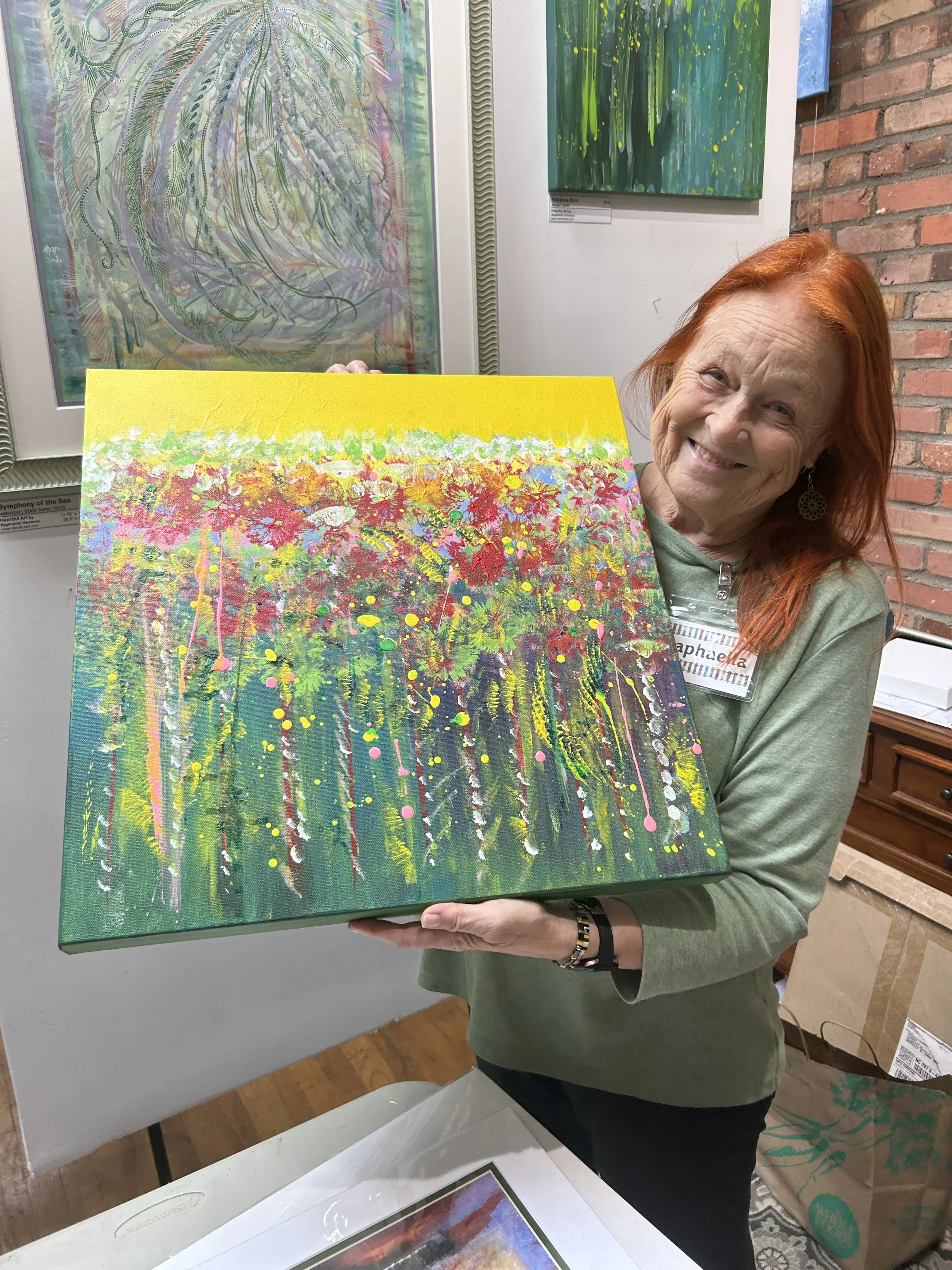 A self-supporting, self-taught artist for almost thirty years, Raphaella paints from her heart and expresses her love of nature, words, and people. Known for her vibrant layering of color on color in intricate watercolor paintings that often took months or years to complete, Raphaella is now embracing a new direction in her art with vibrant abstract gardens in acrylic. The common thread in her artistic expression is a mastery of color.
